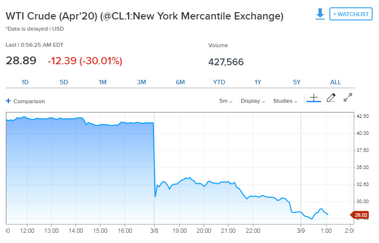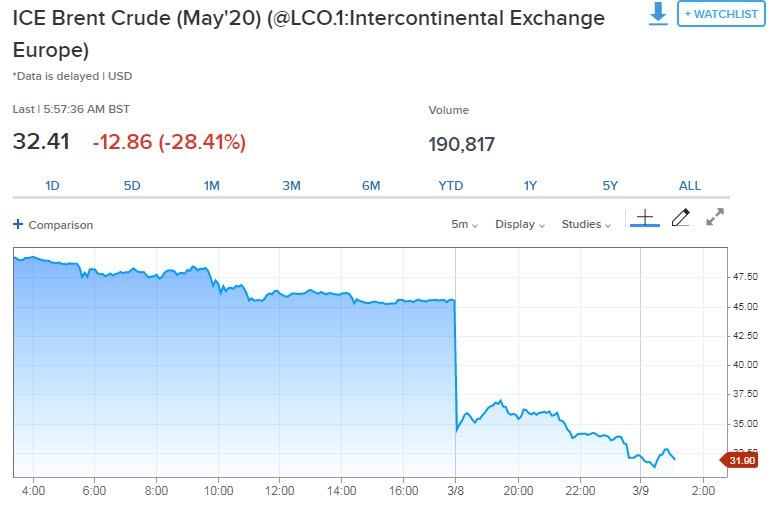 قیمت نفت در شروع معاملات هفتگی بازارهای جهان ۳۰ درصد سقوط کرد؛ به دنبال عدم توافق روسیه و اوپک برای کاهش تولید نفت، عربستان قیمت فروش نفت خود را پایین آورد و جنگ قیمت را کلید زد.